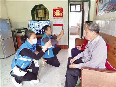3月1日,在琼中营根镇营河巷一处居民楼里,网格员黄秀鲜和符家泽来到符阿伯家里,为他和老伴完成领取高龄补贴人脸认证。