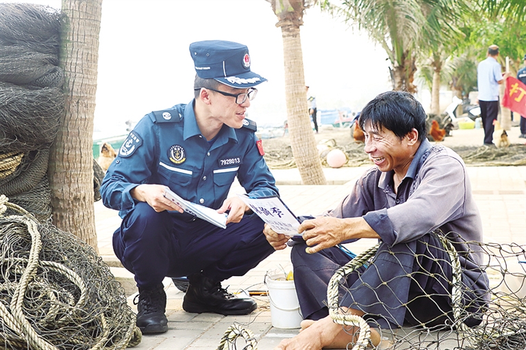 海口海警局澄迈工作站成立休渔服务宣传队,深入辖区渔村、码头等地,面对面向渔民讲解伏季休渔政策和海上安全常识,引导渔船民认清非法捕捞的危害性,自觉遵守和维护海上治安秩序。