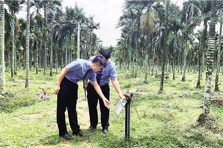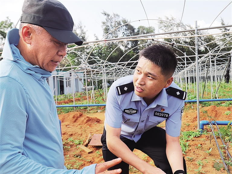 | 省公安厅海岸警察总队第二支队民警张豪强在辖区新园村委会七彩果园种植基地了解村民培育幼苗情况(警方供图) |