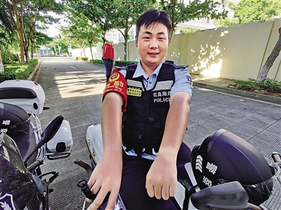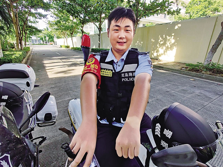 | 海口红岛海岸派出所青年民警街面执勤时被烈日暴晒后留下的印记(警方供图) |