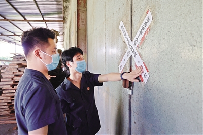 | 省二中院依法强制扣押涉案木材,执行干警在仓库门口贴封条