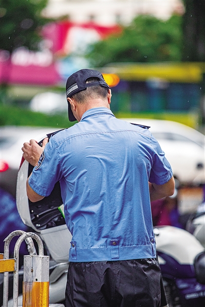 | 正在执勤的海口市公安局交警支队龙华大队五中队民警万长明背部被汗水浸湿 记者符传问 摄 |