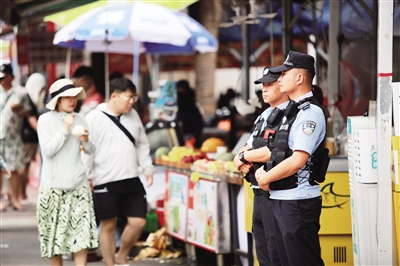 | 三亚市公安局西岛海岸派出所青年民警孙泽华和协警郭海军在西岛小吃街执勤