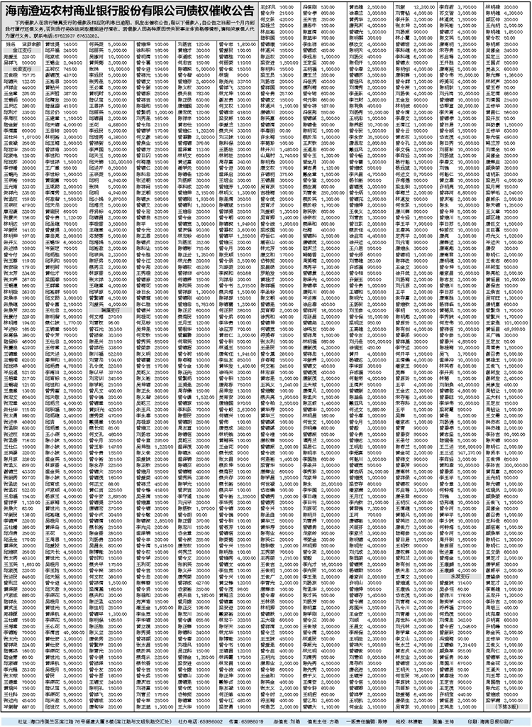 海南澄迈农村商业银行股份有限公司债权催收公告