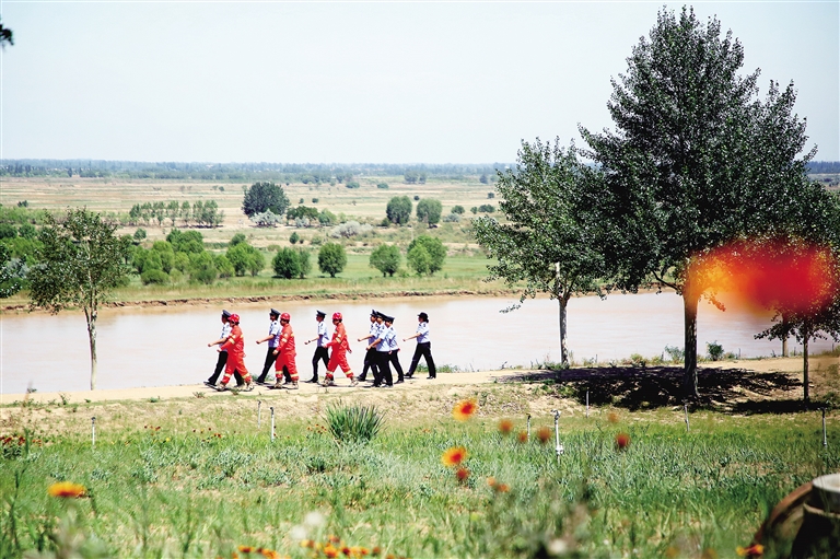 ① 7月23日,银川市公安局苏银分局民警与辖区相关工作人员一起在黄河边徒步巡逻。
