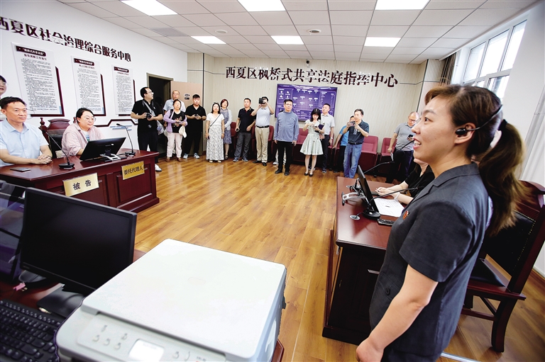 ② 8月28日,“平安建设宁夏行”采访团记者在银川市西夏区综治中心采访。