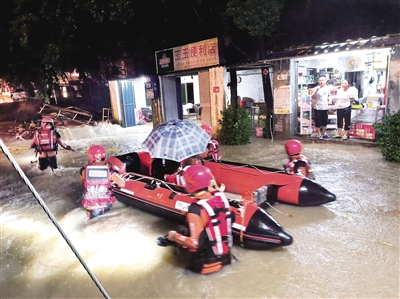 消防救援人员到达现场后,发现该路段积水深度已达60厘米左右,大量雨水正向地势低洼处迅速汇集。指挥员经现场安全评估后,立即下令开展营救。消防救援人员穿戴好个人防护装备后携带救援器材装备在大雨中搜索被困人员,并利用橡皮艇对被困人员进行分批次转移,截至当天18时50分,共成功疏散转移18名被困群众。