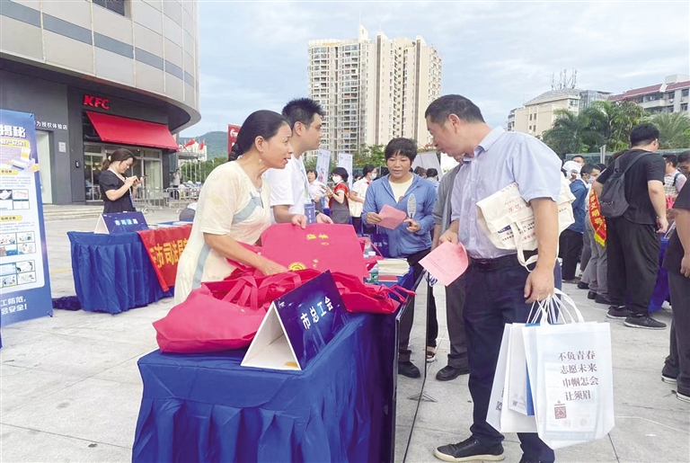 “这是《中华人民共和国民法典》手册,您可以带回家与家人一起学习。”今年6月,三亚市总工会联合市司法局在蓝海广场、明珠广场向职工群众宣传民法典,工作人员一边向过往群众发放宣传手册,一边认真解答群众的法律咨询,接待人数达400余人次。