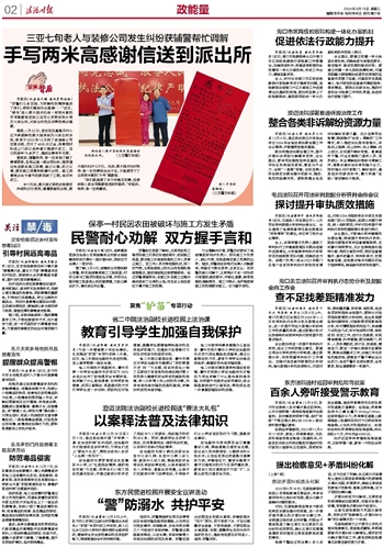 本报讯(记者麦文耀 通讯员陈俊锐)“民警们心系百姓、为民解忧的精神感动了我们,使我们感到无比温暖……”近日,“候鸟”老人郭大娘夫妇将一封两米高的手写感谢信送到三亚市公安局吉阳分局月川派出所,对派出所的及时帮助表示感谢。