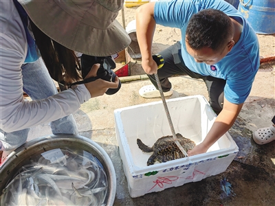 3月8日9时许,蓝丝带海洋保护协会协同海昌生物保育中心派员共同赶赴现场救援。经过兽医的仔细检查,发现该海龟身体并无外伤,且能够正常进食、正常排便,身体均无异样,可直接放生。目前,派出所已联合工作人员将该海龟放生至相关海域。