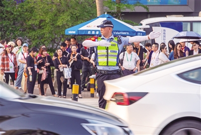记者注意到,从海口市国家帆船基地公共码头附近路段开始,至举办场地海南国际会展中心,其间每个重点路口均有警力部署,会场周边设置一步一岗,让“迷糊”的司机能很快得到及时指引。