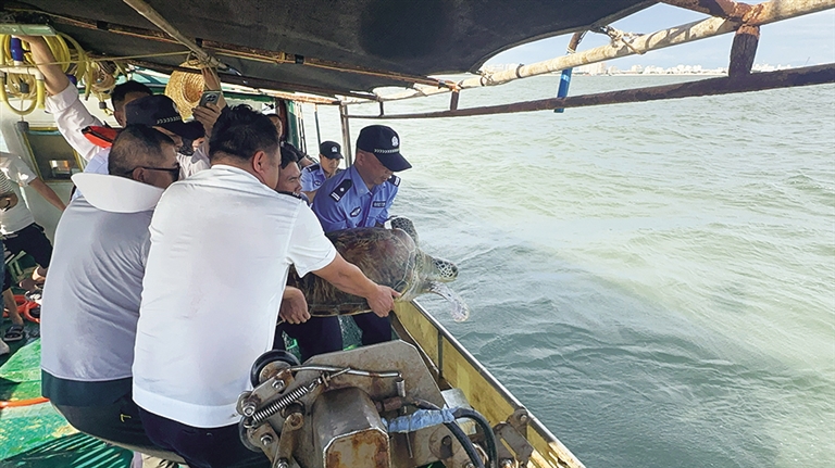 6月3日下午,东方市公安局新村海岸派出所联合东方市渔政事务服务中心、新龙镇政府、八所港海岸派出所及东方亿鑫水产有限公司等多部门,成功救治两只误入东方亿鑫水产有限公司鱼塘的国家重点保护野生动物玳瑁,并将它们放归大海。