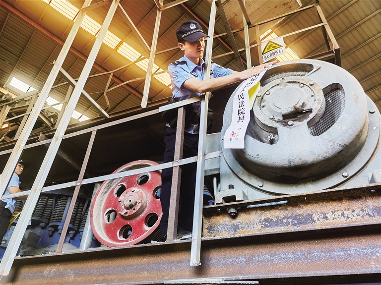 执行现场为一处采石场。法院工作人员停好车后,戴好安全帽前往大型机器设备所在位置。有的法警爬上巨大的机器设备,有的在现场拉好警戒线并对执行标的物贴好封条。