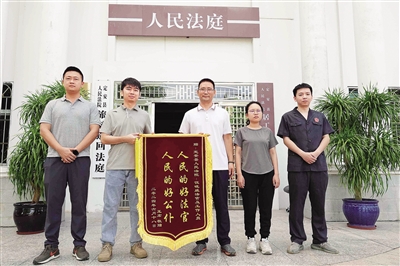 “伍庭长,终于等到您了,要不是您和工作人员快速高效地把案子审结,我半夜都要睡不着,感谢你们的帮助!”近日,在定安县人民法院居丁人民法庭门前,一名男子拿着锦旗,看到居丁人民法庭庭长伍晓威过来,异议人王女士的爱人付先生向他们表示感谢,并赞扬他们认真负责的工作态度。