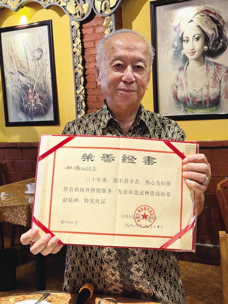 杜添江退休那年,中国侨联给他颁发了“为侨服务30年荣誉证书”。他说:“我希望中国和印尼的关系越来越好,而我们的后辈也将为之努力。”