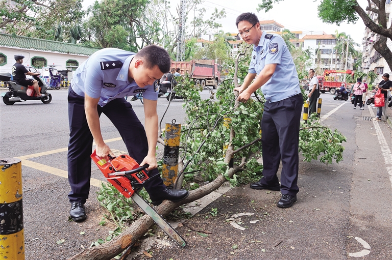 余彬辉口中的“老桥”是受伤的民警平海桥,他的鼻子被树枝横扫过去,瞬间出血。“有那么几秒是没知觉的,我的第一反应是摸摸鼻子,再一看手,都是血。”平海桥对记者说,他只是皮外伤,还能继续清理树枝,余彬辉更严重些。