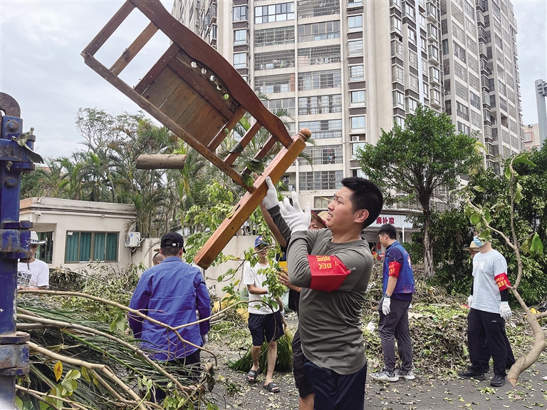 9月10日,省高院志愿者队伍共参与清理道路4条,清运道路垃圾30余车。省二中院组织党员干警、青年志愿者参与儋州灾后城区道路清障工作。