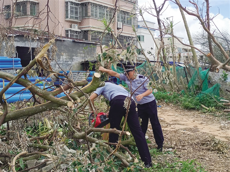 柯维锋介绍,由于此次台风的威力巨大,镇里各条道路的树木均受到不同程度的影响,出现倒伏、断枝、倾斜等情况,因此翁田派出所迅速组织力量,联合辖区村委会等,第一时间使用砍刀、电锯等工具,采取分段截断的方式,将被强风吹倒的树木逐一清除,以最快速度消除道路阻断。“所里的油锯和砍树的刀都用坏了好几个。”柯维锋说。