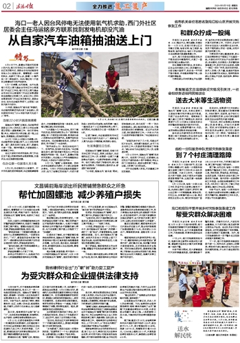 9月13日以来,省检一分院20名工作队员坚守在文昌锦山镇抗灾一线,先后到山雅村、达里村、罗民村、锦山社区等7个村清理路障、清除垃圾、打扫卫生,共清理村道8.4公里、清运树枝及垃圾42车、清扫村民活动广场3处2100余平方米,为恢复交通及供电、复工复产创造了有利条件。
