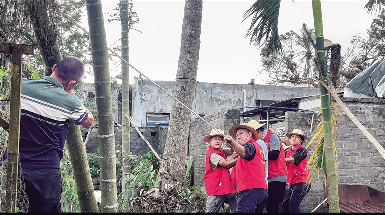 槟榔树、山柚树被吹倒,养殖基地被破坏……走进海口东山镇前进村委会辖区,台风“摩羯”对乡村产业的破坏随处可见。9月18日上午,省委政法委灾后恢复党员志愿者服务队队员在村里走访时,看到农户陈儒三正在吃力地扶正槟榔树。“大爷您一个人扶,别伤到腰,我们帮您用绳子拉起来吧!”志愿者服务队领队秦禧当即指挥队员们加入扶正槟榔树工作中来。