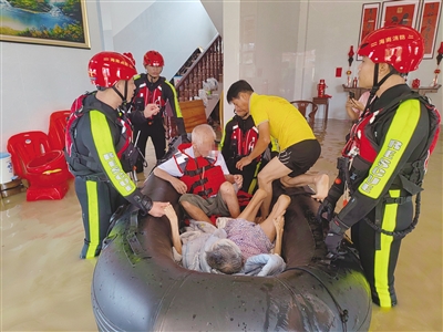 9月24日7时12分,乐东黎族自治县黄流镇孔汶村三队发生内涝,17号居民楼中4人被积水围困,其中还有行动不便的老人,急需转移。乐东消防救援大队接到报警后立即调派消防救援人员赶赴现场处置。