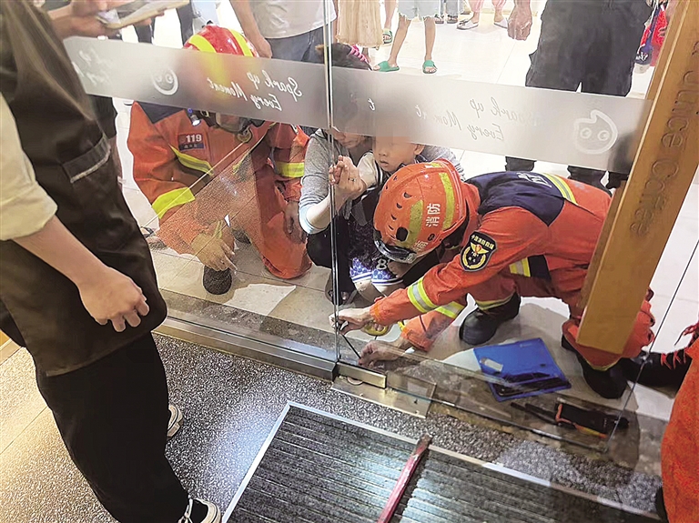 10月13日,临高县消防救援大队在临城镇富罗广场救援一名手指被玻璃门卡住的3岁男童。