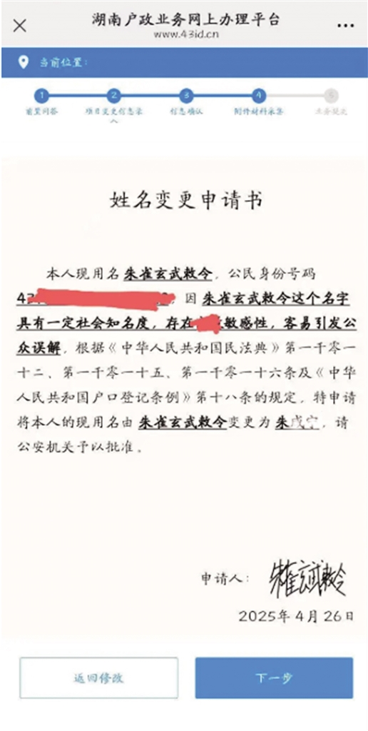 4月26日下午,在广东韶关工作的湖南省郴州市桂阳县“00后”小伙“朱雀玄武敕令”,登录湖南政务服务网,申请将现在的名字“朱雀玄武敕令”改为“朱某宁”。据悉,这已经是他在一年内第4次改名了,出生时名为朱某飞。从2024年5月开始,他先后改名为“朱雀玄武”“朱雀玄武敕令”,今年4月16日,“朱雀玄武敕令”登录湖南政务服务网申请改名为“周天紫薇大帝”,但申请未予以通过。4月26日15时许,“朱雀玄武敕令”再次申请改名“朱某某”。他表示,这个名字得到了他家人的认可。