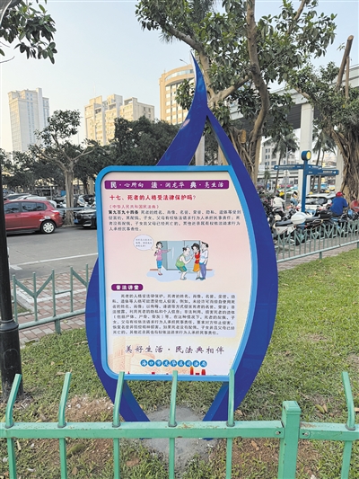 公园内设置的“民法典简介”“民法典如何保护未成年人”等6大主题35块法治宣传标识标牌,以图文并茂的形式将抽象的法律条文转化为通俗易懂的生活场景。从民法典的诞生历程到具体法律条文对婚姻家庭、财产保护、人格权等民生领域的规范,每一块标牌都是一个法治知识点的缩影,让居民在散步、健身的过程中,不经意间就能与法律知识相遇。这种“沉浸式”的普法方式,打破了传统普法教育的刻板印象,使法治文化不再是书本上冰冷的文字,而是成为可感知、可触摸的生活元素。