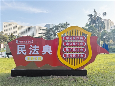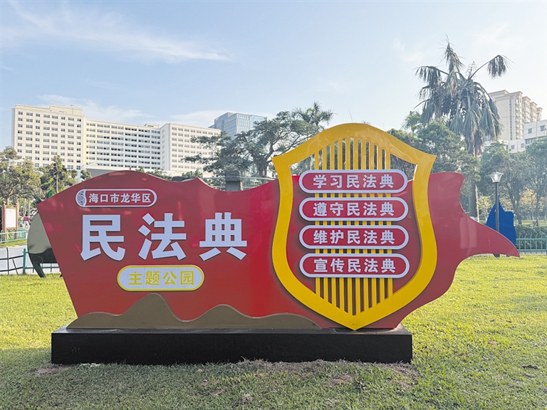 在海口龙昆北路与华海路交叉口南侧,一座占地约1.5万平方米的民法典主题公园如同一本立体的法治教科书,静静矗立在城市繁华之中。这座集法治文化宣传、健身娱乐、文化活动于一体的综合性公园,以“融法于景、寓教于园”为设计理念,将《中华人民共和国民法典》的精神内核与公园的景观设计巧妙融合,开辟了法治宣传的新阵地。