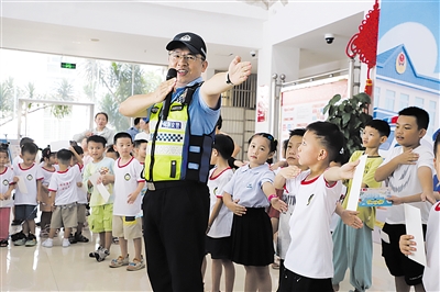 “小朋友们,看这里!这个手势代表停止……”在轻松活泼的氛围中,孩子们兴致勃勃地跟着交警叔叔学习交通指挥手势操。从基础的停止信号到直行、转弯手势,萌娃们学得格外认真,一板一眼地比划着。这堂生动有趣的课堂,让孩子们在互动中掌握了安全知识,在心中播下了遵守交规、文明出行的种子。