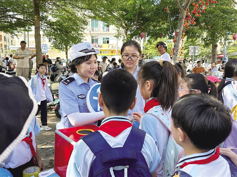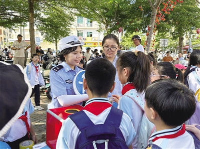 开学首日,东方市公安局全面启动护学岗,严格落实校园安全防范措施,维护校园周边良好治安环境,用责任与爱心引导学生有序入校,在为学生安全保驾护航的同时也架起了警民之间的“暖心桥”。根据开学首日交通流量变化,该局民警、辅警全部提前到岗,在交通高峰时段和重点路段加强交通疏导,并在各辖区学校重点路段引导接送车辆有序通行、规范停放,守护平安“上学路”。民警、辅警走进校园上好“开学第一课”,课程围绕交通安全、防校园欺凌等知识,通过案例讲解、互动问答等多种形式,引导学生们提升自我保护意识与防范能力。