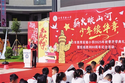 | 9月1日,海口秀英法院少年法庭副庭长、西秀实验小学法治副校长刘茜在开学典礼现场为学生们带来生动精彩的“开学第一课”。通讯员田诗默 摄 |