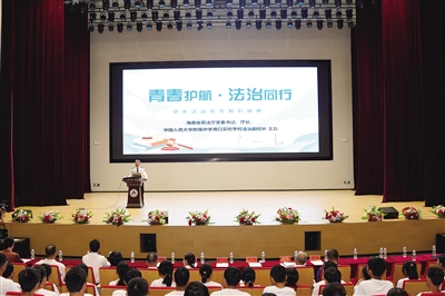 | 9月1日,省司法厅党委书记、厅长,人大附中海口实验学校法治副校长王磊为该校初一、高一新生上了一堂别开生面的“开学法治第一课”。高凌 摄 |
