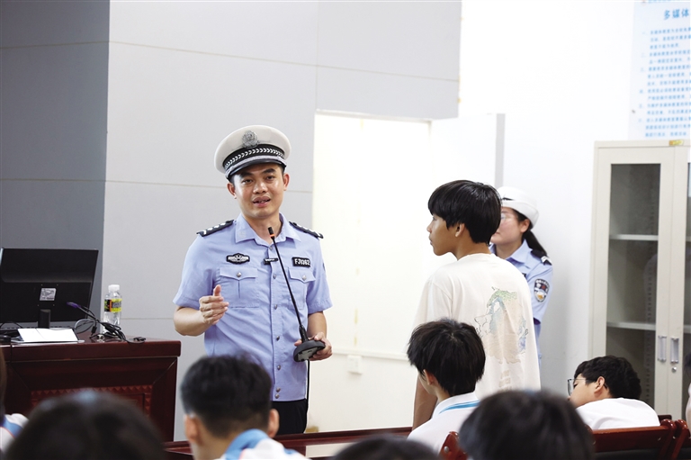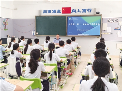 | 9月1日,三亚市公安局崖州分局崖州湾科技城派出所副所长颜铄沣在上海世外中学上“开学法治第一课”。(三亚警方供图) |