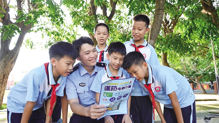 | 9月1日,昌江黎族自治县公安局河北派出所民警进校园开展“法治安全第一课”,向学生宣传反诈知识。(昌江警方供图) |
