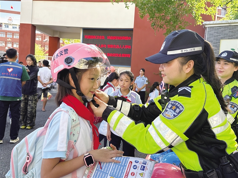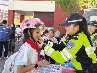 | 9月1日,陵水黎族自治县公安局交警在中山小学开展“交通安全第一课”活动,向参与互动的小学生赠送安全头盔。(陵水警方供图) |