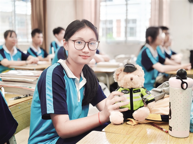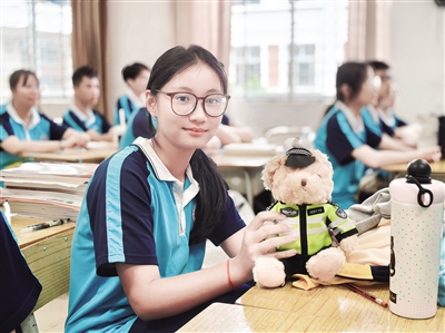 | 9月1日,华中师范大学琼中附属中学学生在新学期“安全第一课”活动积极互动,获民警赠送交警小熊玩偶。(琼中警方供图) |