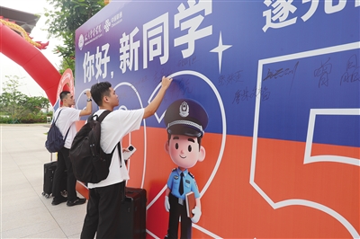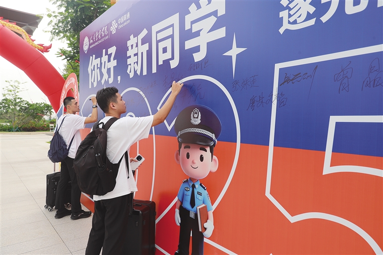 上午8时,海南警察学院校园里,“你好,新同学”的巨大展板前,很多新生和家长在驻足拍照。这一刻,热情的老师化身摄影师,将一个又一个温暖的故事和美好瞬间记录下来。