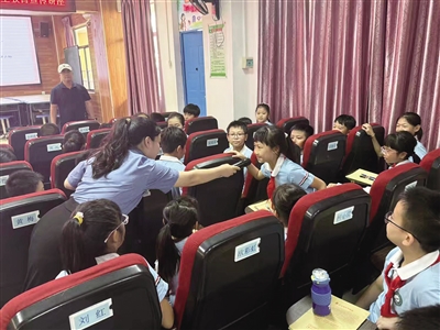 这是记者近日在海口市白龙中心小学看到的学生与干警互动的画面。据了解,为共同筑牢未成年人健康成长防线,构建司法与社区协同发展的一体化保护体系,海口市美兰区人民检察院与海口市美兰区和平南街道办事处建立和平南美未同心护苗工作站,进一步深化未成年人护苗专项行动工作成效。