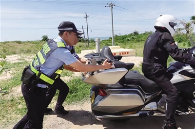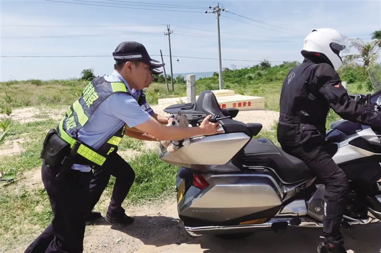 10月1日下午,铺前派出所执勤民警巡逻至木兰湾段时,发现一名骑手因不熟悉路况,摩托车后轮深陷路边沙地无法驶出。民警立即上前,一边指挥过往车辆注意避让,一边合力帮助推车。经过不懈努力,终于将重达数百斤的摩托车推回硬化路面。(法治时报全媒体记者 舒耀剑 通讯员 曾渲棋)
