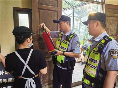 在一家甜品店,伊照伟拿起灭火器,认真查看灭火器的压力是否正常、是否在有效期内,并现场指导店员如何正确使用灭火器。“一定要定期检查灭火器,确保在紧急情况下能够正常使用。同时,你们还要提高安全防范意识,提醒游客注意保管好自身财物。”伊照伟一边检查,一边详细询问店里的安保情况,提醒店员要加强店内的安全管理工作。