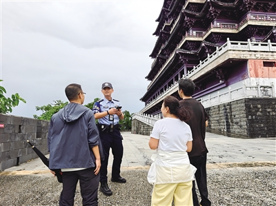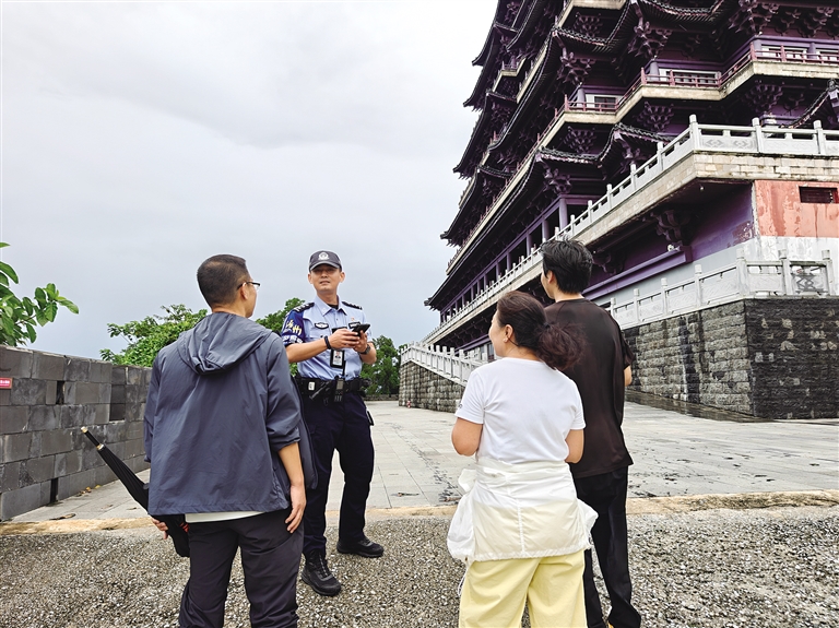 随后,执勤民警又继续沿着楼梯逐层向上巡查,走访景区监控室,检查景区各处设施安全状况,确认栏杆稳固、警示标志清晰可见。陶俊杰弯腰捡起被风刮断的树枝,又顺手扶正一块倒地的导览牌。尽管风雨未歇,但儋阳楼景区内的安全隐患已基本排除,只待评估通过后有序开放。