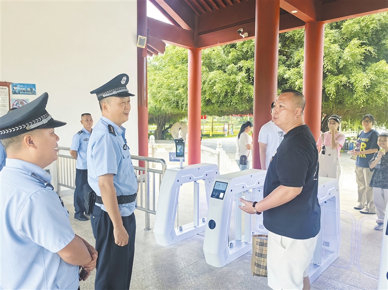 在景区,儋州公安机关坚持显性用警、动中备勤,采取“车巡+步巡”“定点+流动”相结合的方式,提高巡逻防控频次和密度,快速高效处置各类案(事)件,做到景中有“警”,全面提升景区应急处置能力。