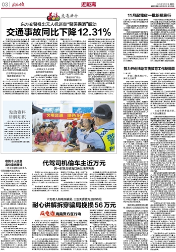 今年国庆中秋假期,游客在景区体验到了无人机巡查的“旅游警务”带来的安全感。如今,这份“安全感”已不再局限于景区。东方公安交警在交通巡查方面引入了无人机巡查新模式,让这份“安全感”时刻护航市民出行。“我们每天至少开展3次空中巡查,重点覆盖事故多发路段,能够及时发现路面隐患、监测违法行为,并可第一时间参与应急处置,大幅提升了管控效率和精准度。”东方公安交警有关负责人说。