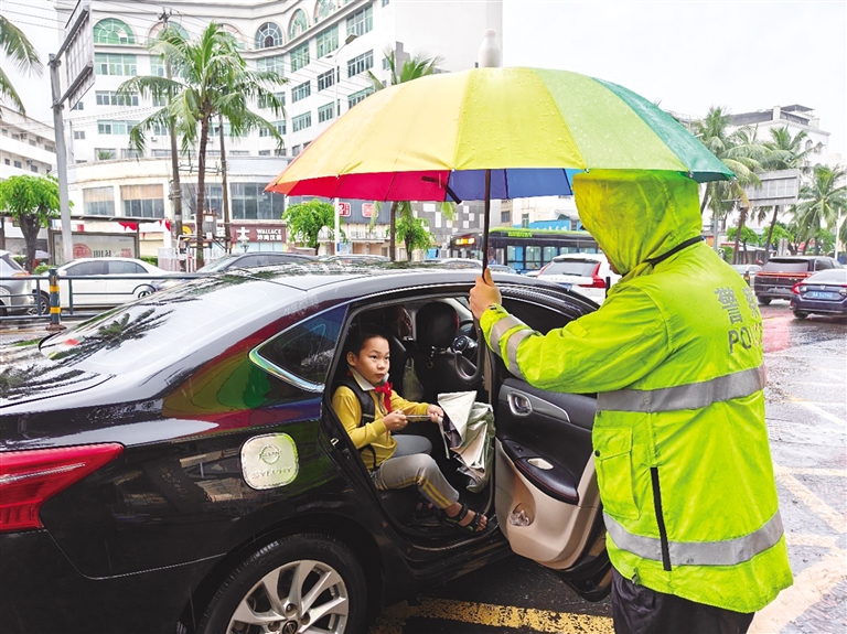 11月4日,受台风“海鸥”影响,降雨天气给学生上学出行造成极大的不便。为保障学生上学出行安全,海口市公安局交通警察支队琼山大队提前部署、冒雨值守,在辖区中小学门口雨中护学岗,为学生们撑起“平安伞”。(法治时报全媒体记者 黄君)