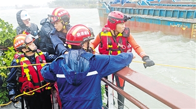 他们以“温情”护群众,完成“为民的接力”。“多亏你们来得及时,不然船撞桥就糟了!”10月5日11时43分,台风“麦德姆”来势汹汹,海口市美兰区长堤路钟楼附近海甸溪上,一艘钢质泥驳船在台风中失控,径直向人民桥漂去,船上2名渔民和1名船员命悬一线。接到报警后,支队迅速调派长堤、金融、海甸3个消防站,携抢险车、冲锋舟、水上机器人等装备火速驰援。抵达现场后,消防救援人员顶着强风雨建立绳索保护系统,配合海事局固定船舶,小心翼翼将3名被困人员牵引至船上。历经近2小时奋战,最终将船只安全驶离危险区域,一场船桥碰撞的险情化险为夷。船员紧紧握着消防员被汗水浸透的双手,质朴的感谢里满是劫后余生的安心,定格成“火焰蓝”与群众鱼水相依的温情瞬间。