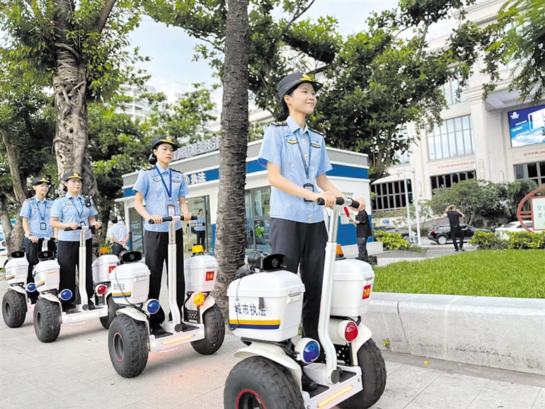 11月6日清晨,朝阳跃出海面,阳光透过摇曳的椰叶洒在干净整洁的街道上,身着统一制服的白鹭女子执法队队员们整装待发,开始新一天的工作。