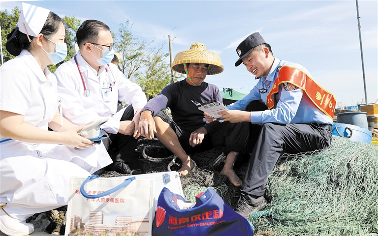 “民警把反走私法律知识送到港口和船头,讲得明白、听得清楚,让我们知道什么能干、什么不能干,心里更有底了。”渔船民周春胜在三联社区附近的外坪港,一边忙着修补渔网,一边聆听民警的反走私普法宣传。活动现场,省公安厅反走私和海岸管理总队反走私支队、第一支队和新埠海岸派出所民警、辅警,通过悬挂宣传横幅,设立咨询台,解读政策、案例警示,互动答疑以及发放防范离岛免税“套代购”走私宣传册等方式,见缝插针地向群众和渔船民开展反走私普法宣传工作,并派出小分队将义诊和普法送到腿脚不方便的群众家中以及渔港,推动反走私知识“飞入寻常百姓家”。