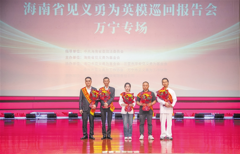 参加万宁专场报告会的5位英模及家属分别是:从翻涌的浪涛中救起一对母女的“白衣小哥”、获评全国见义勇为模范的林佳泰;凭一把塑料椅制服持刀行凶歹徒、获评全国见义勇为模范的杨广聪;遭遇家庭巨变自强而又感恩的全省见义勇为先进分子卜甲运之女卜玉妹;高速公路上从侧翻汽车中救出一家四口、入选中央政法委见义勇为勇士榜的万宁市民周仕敏;在两名儿童被海浪卷走时挺身而出、获评全省见义勇为先进群体代表的黄修才。