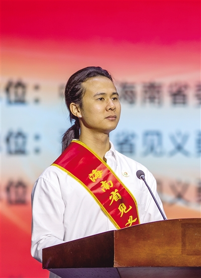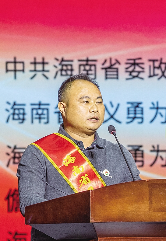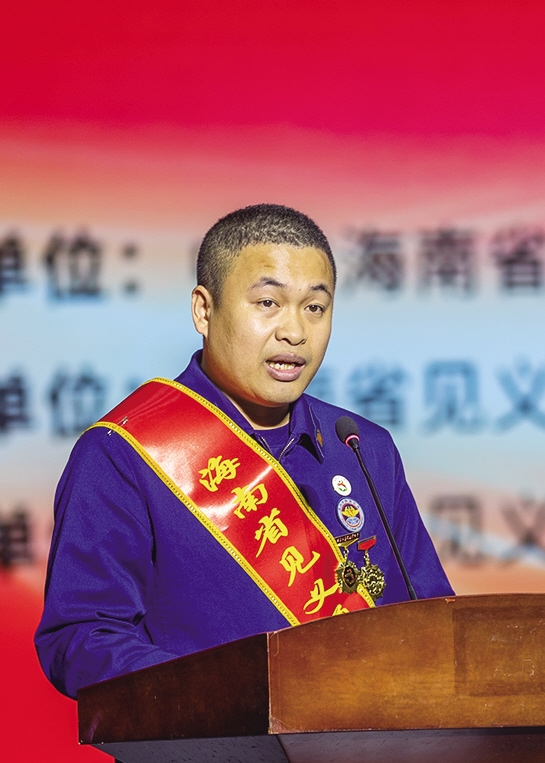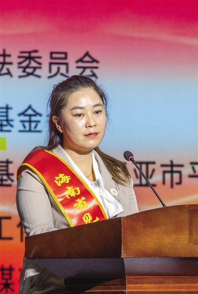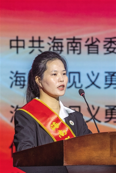 台上,第十五届全国见义勇为模范林佳泰、杨广聪,第十二届海南省见义勇为先进分子卜甲运的女儿卜玉妹,第十六届海南省见义勇为先进分子薛深海,第九届海南省见义勇为先进分子王如发的妻子张小英深情讲述。